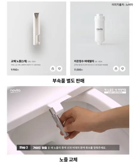 비데의 대표적인 부속품은 노즐과 필터인데요. 노즐 교체는 빼고 끼우기만 하면 되기 때문에 난이도를 논할 정도도 아니며, 필터도 돌려서 빼고 끼기만 하면 돼서 상당히 쉽습니다.