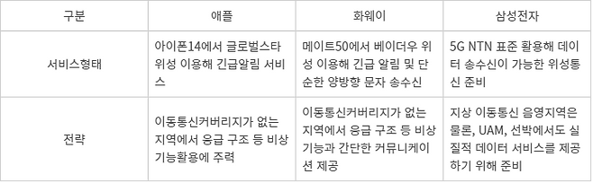 다만, NTN 기술이 준비되기 전까지 애플·화웨이와 유사한 형태의 비상 위성통신 기능 탑재도 시장성을 분석하면서 지속 검토하는 것으로 관측된다.