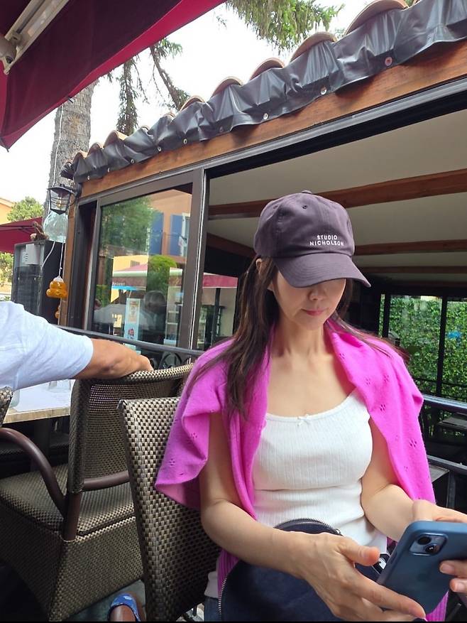 야외 테라스에서 강수지는 화이트 슬리브리스와 진, 그리고 어깨에 핑크 컬러 니트를 걸쳐 산뜻한 포인트를 주고 있다. ‘STUDIO NICHOLSON’ 로고가 새겨진 볼캡으로 캐주얼함을 강조했으며, 심플한 아이템 조합에 컬러 포인트를 더해 경쾌한 여름 분위기를 연출한다.