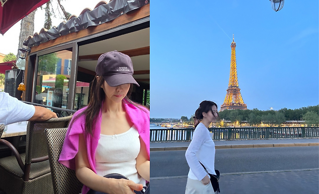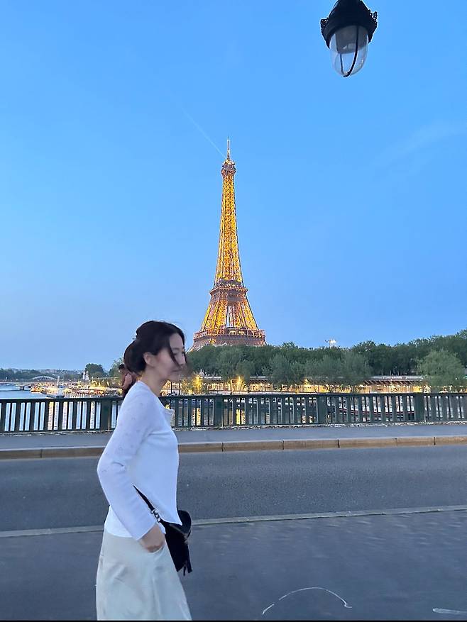 에펠탑을 배경으로 한 사진에서 강수지는 화이트 니트와 롱스커트, 블랙 미니백을 매치해 우아하고 로맨틱한 무드를 완성하고 있다. 심플한 헤어 스타일과 미니멀한 액세서리로 파리의 감성을 한껏 살린 세련된 여행룩을 선보인다.