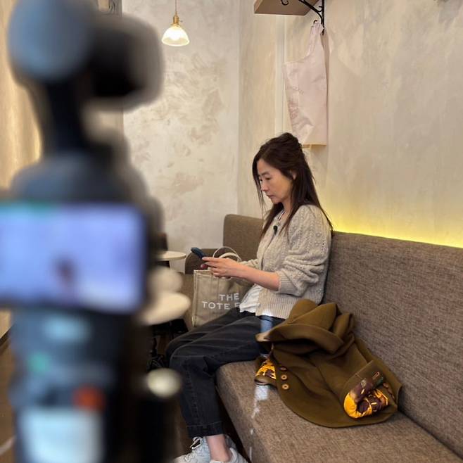 카페에서 포착된 강수지는 그레이 니트 가디건과 블랙 진, 화이트 스니커즈로 편안하면서도 스타일리시한 분위기를 연출하고 있다. 내추럴한 웨이브 헤어와 미니멀한 액세서리, 그리고 옆에 놓인 카키색 코트가 계절감을 더한다. 전체적으로 힘을 뺀 듯하지만 세련된 감각이 돋보이는 일상룩이다.