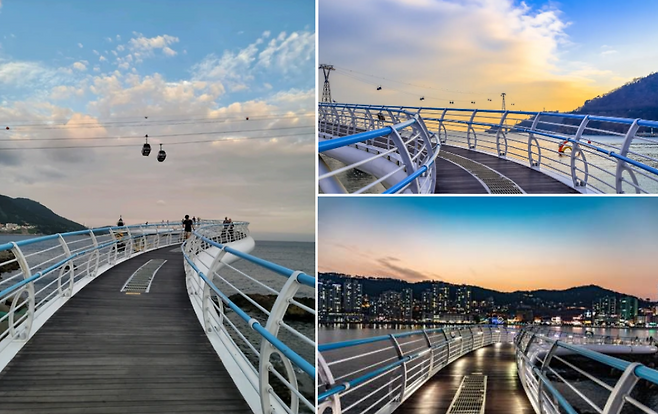탁 트인 해안 풍경과 함께 기념사진을 남길 수 있는 전망대와 포토존이 마련되어 있으며, 밤이면 다리에 조명이 들어와 주변 야경과 근사하게 어우러진다고 합니다. 특히 송도구름산책로 위 송도해상케이블카가 오색 불빛을 반짝이며 밤하늘을 수놓는 경관이 예술이라고 하죠.