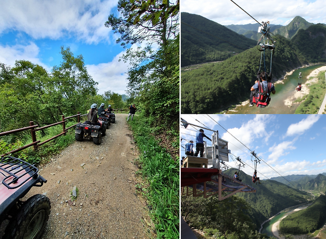 전망대까지는 나무데크길이 걷기 편하도록 놓여져 있는데요. 울창한 나무들이 숲길을 이루는 상쾌한 자연을 만끽할 수 있습니다. 전망대 바로 옆으로는 짚 와이어를 탈 수 있는 공간이 마련되어 있으며, 이 외에도 짚코스터, 짚라인, 어드벤처, ATV, 글램핑 등 더욱 다양하게 산을 즐길 수 있는 액티비티를 체험해보는 것도 추천드립니다.