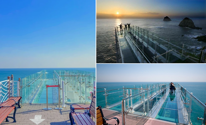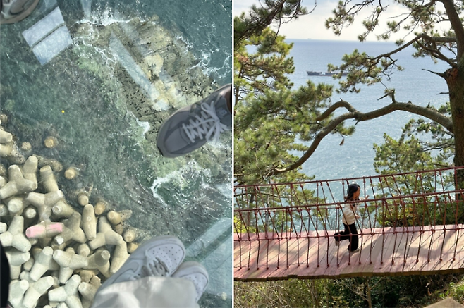 부산 오륙도 스카이워크는 9m 가량 바다쪽으로 돌출된 말발굽형 스카이워크인데요. 동해와 남해가 만나는 에메랄드 빛 오륙도 앞바다는 그야말로 장관이라고 합니다. 투명 유리바닥 아래로 해안 절벽에 부딪히는 파도의 포말은 아찔한 장관을 연출한다고 하죠.