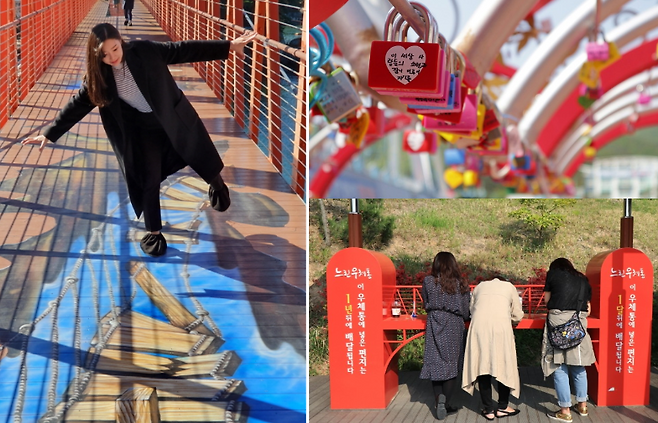 야간에는 LED 조명이 빛을 발하며 신비로운 은하수 길이 연출됩니다. 사랑의 자물쇠, 느린 우체통 등이 있어 연인들의 데이트 코스로도 유명한데요. 곳곳에 착시를 일으키는 트릭아트 포토존이 조성되어 있어 인생샷을 건지기에도 좋습니다.
