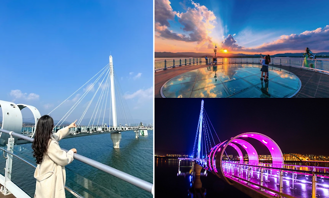 탁 트인 해안 풍경과 함께 기념사진을 남길 수 있는 전망대와 포토존이 마련되어 있으며, 밤이면 다리에 조명이 들어와 주변 야경과 근사하게 어우러진다고 합니다. 특히 송도구름산책로 위 송도해상케이블카가 오색 불빛을 반짝이며 밤하늘을 수놓는 경관이 예술이라고 하죠.