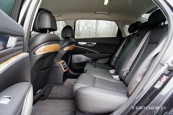 실내공간은 K9의 가장 큰 장점 중 하나로 쿠페형 실루엣을 사용하지 않은 탓에 레그룸은 물론 1열과 2열의 헤드룸이 여유롭다. 특히 2열 시트의 착좌감이 인상적인데, 전동식 리클라이닝 옵션을 선택하지 않아도 충분히 좋은 구성이다. G80 대비 2열 개방감이 좋은 편이다.