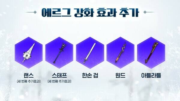 이와 함께 ‘에르그’ 시스템도 대폭 개편된다. 먼저 스킬에 따라 무기 선택폭을 넓히기 위해 ‘한손검’, ‘원드’ 등 ‘에르그‘ 강화 효과가 없던 무기군 모두에 강화 효과가 추가되며, 랜스와 스태프에는 새로운 효과가 생긴다. 또한 ‘에르그’ 접근성 향상을 위해 하위 단계 ‘에르그’를 새롭게 추가한다. 하위 단계에서는 보다 구하기 쉬운 재료들로 강화 시도를 할 수 있고, 상위 등급 ‘에르그’로 승급도 가능하다.