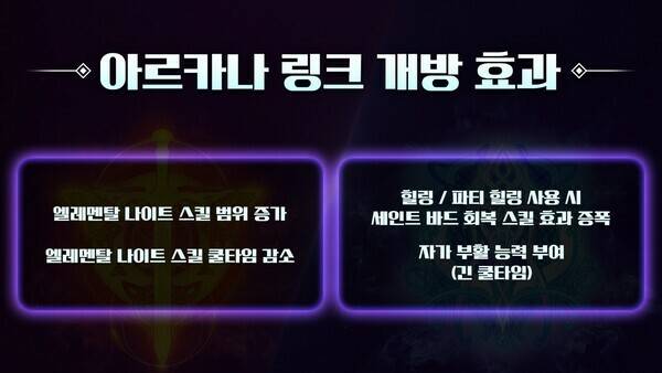 또한, ‘글렌 베르나’ 던전에서는 아르카나 링크를 6단계부터 10단계까지 개방해 추가 성장이 가능해진다. 새로운 불타래를 통해 진행하는 추가 성장에서는 각 ‘엘레멘탈 나이트’와 ‘세인트 바드’의 ‘아르카나’ 재능에 더욱 특별한 효과가 부여된다. ‘엘레멘탈 나이트’는 전용 스킬 범위 증가, 쿨타임 감소 등의 효과가 추가되고, ‘세인트 바드’는 회복 스킬 효과 증폭, 파티 전멸 상황에서 재도전을 도와주는 자가 부활 능력이 추가된다.