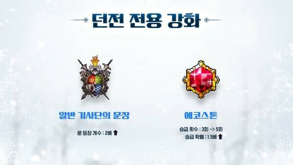초반 성장을 마친 이용자들이 던전을 통해서만 도전할 수 있는 ‘에코스톤’과 ‘알반 기사단의 문장’의 강화 소요 시간 단축을 위한 개편도 이뤄진다. ‘에코스톤’은 기존 대비 승급 가능성이 최소 1.5배 이상 증가하며, 시도도 5번으로 증가한다. 각성 시 ‘어빌리티 포인트(AP)’를 지나치게 소모하지 않도록 누적 레벨에 따라 각성 횟수를 제한한다. ‘어빌리티 포인트’의 중요성이 상대적으로 낮아지는 누적 레벨 5만부터는 각성 횟수 제한이 해제된다. ‘알반 기사단의 문장’은 ‘룬’ 드랍 개수를 최소 2배 이상 늘려 더 많은 강화 시도를 지원한다.