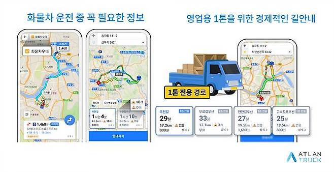 아틀란 트럭은 국내 최대 규모의 화물차 높이·중량 데이터와 전국 도로 환경 실사를 기반으로 한 영상·위성 데이터를 딥러닝 기술로 분석해 최적의 주행 경로를 제공한다. 일반 승용차용 내비게이션이 제공하지 못하는 톤수별 맞춤 경로, 도로 폭·회전각도 계산 등 화물차 전용 기능을 통해 운전자 안전과 운송 효율성을 동시에 확보한다.