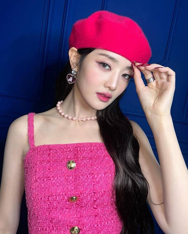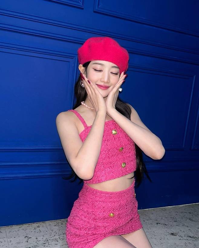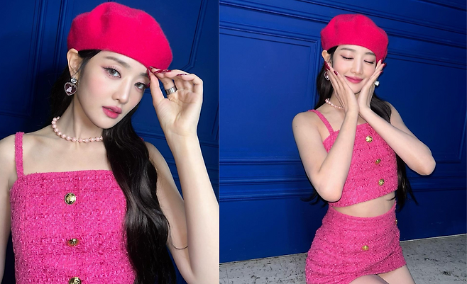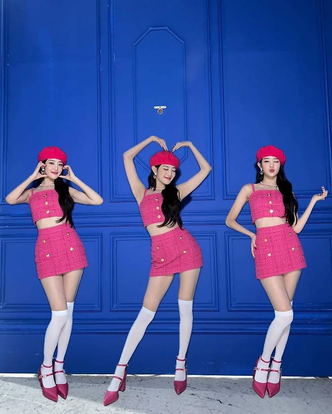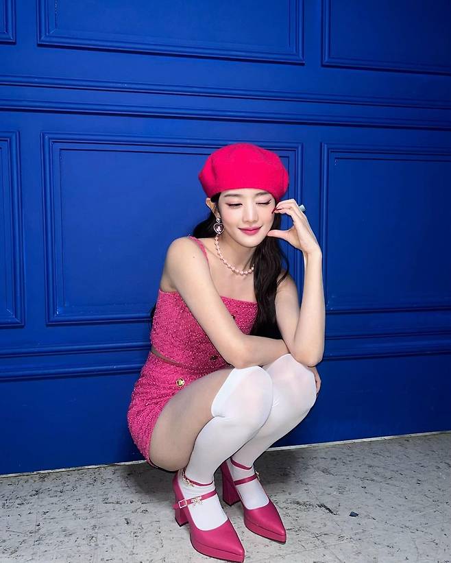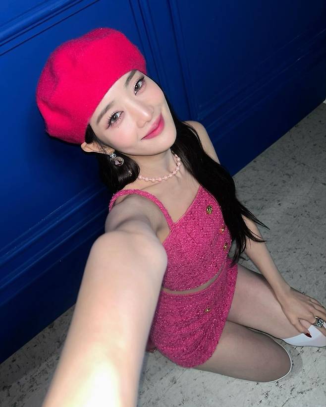 사진 속 민니는 핑크 트위드 나시 크롭티를 입고 미니 스커트와 베레모를 썼다. 흰 롱삭스와 핑크 힐을 신고 러블리한 핑크룩을 선보였다.