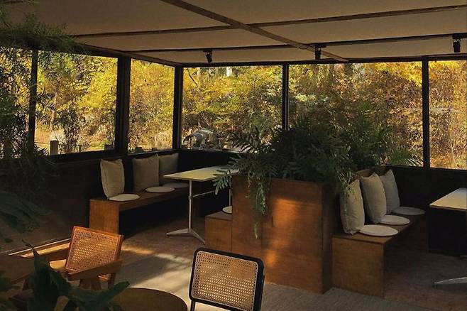 몽브루의 넓은 야외 테라스에서는 커피 한 잔과 함께 단풍이 든 나무들을 감상할 수 있어 가을 시즌에 특히 많은 이들이 찾습니다.