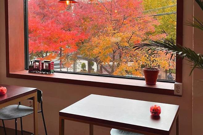 내부는 심플하면서도 세련된 인테리어로 꾸며져 있으며, 바깥의 은은한 단풍 풍경이 카페의 아늑한 분위기와 잘 어우러집니다.