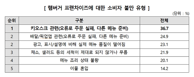 그러나 햄버거 프랜차이즈를 통해 소비자 불만을 경험했다고 응답한 소비자(169명) 중에서 키오스크 오류로 주문이 실패하거나 다른 메뉴가 준비되는 등의 문제를 겪은 비율이 36.7%(62명)에 이르러 이에 대한 개선이 시급한 것으로 나타났다.