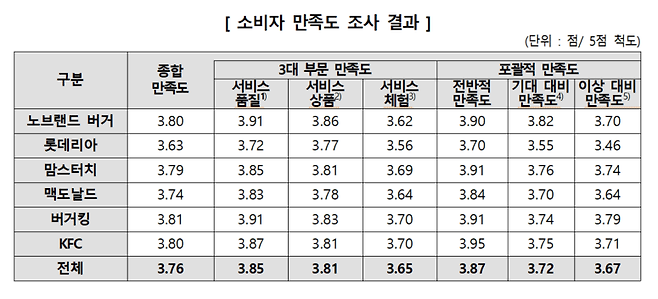 조사대상 6개 햄버거 프랜차이즈의 평균 종합만족도는 3.76점이었고, 사업자별로는 버거킹이 가장 높은 점수를 받았다. 버거킹과 노브랜드 버거는 항목별 1~2위를 싹쓸이했다. 최하 점수를 받은 프랜차이즈는 롯데리아였다. 업체별 만족도 점수는 최고 3.81점에서 최저 3.63점으로 조사대상 업체 간 편차는 크지 않았다. 부문별 만족도는 ‘서비스 품질’이 3.85점으로 가장 높았고, ‘서비스 상품(3.81점)’, ‘서비스 체험(3.65점)’의 순이었다.