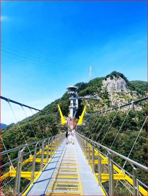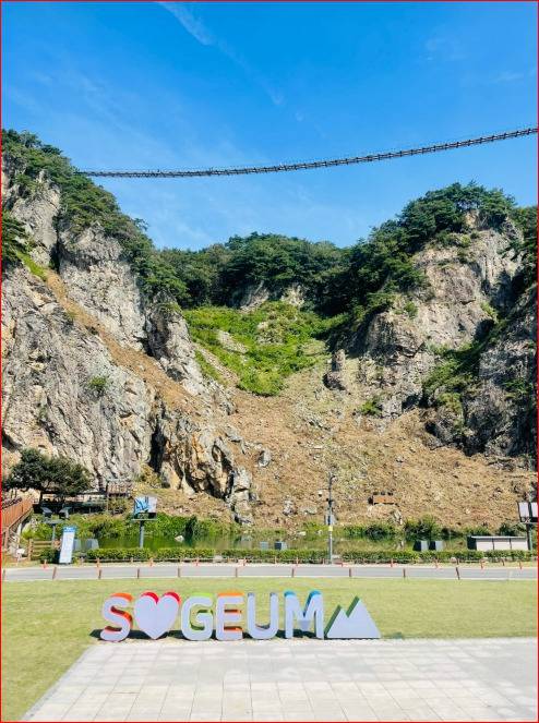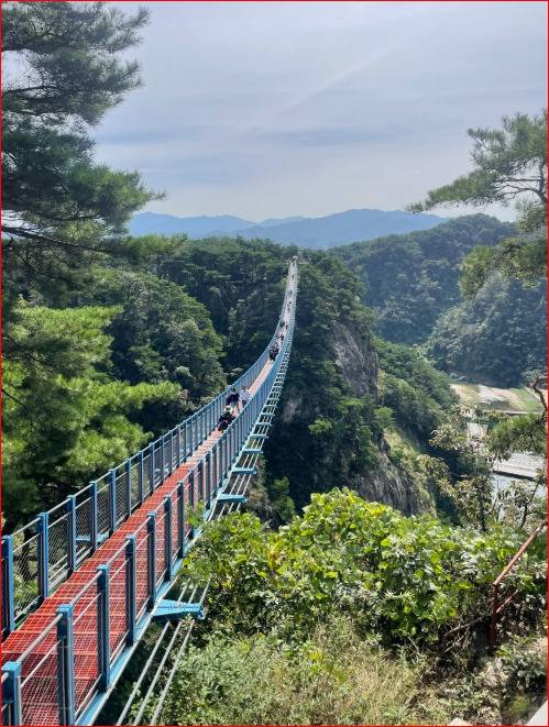 길이 200m, 높이 100m의 출렁다리는 기암괴석과 삼산천이 어우러진 풍경 위를 걷는 듯한 아찔한 경험을 선사합니다.