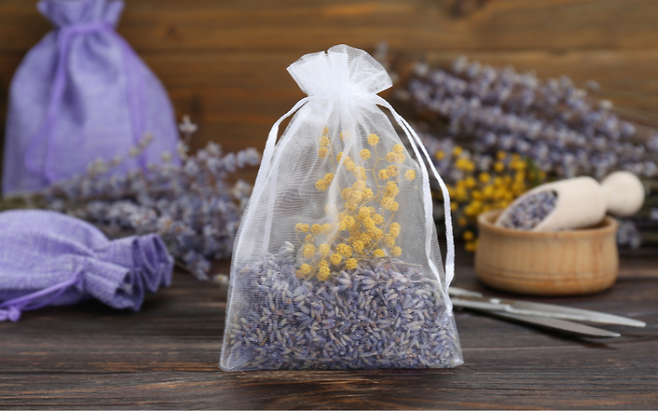 침대 밑에 라벤더, 캐모마일, 일랑일랑 등 천연 아로마 허브가 담긴 주머니를 놓으면 은은한 향이 침구를 감싸며 긴장된 신경을 완화하고 불면증 완화에 도움을 줍니다.