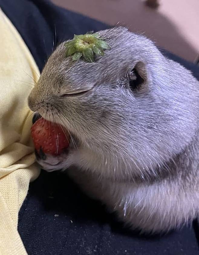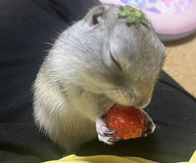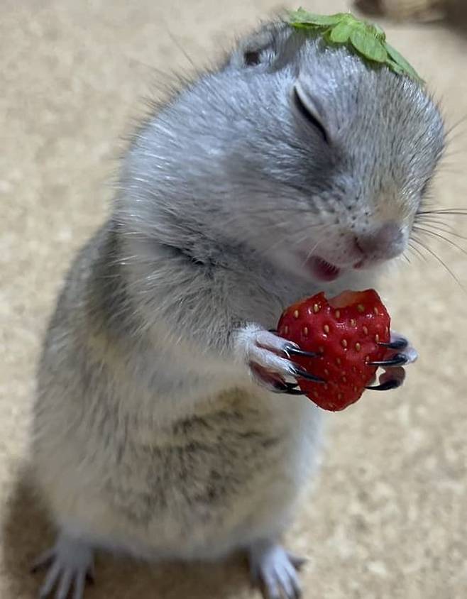 공개된 사진 속에는 다람쥐 같아 보이기도 하고 햄스터 같아 보이는 의문의 동물이 머리에는 딸기 꼭지를, 품에는 딸기를 꼭 끌어안고 두 눈을 지그시 감은 채 자고 있었죠.