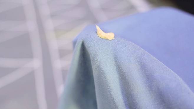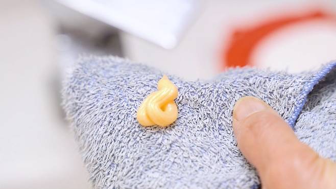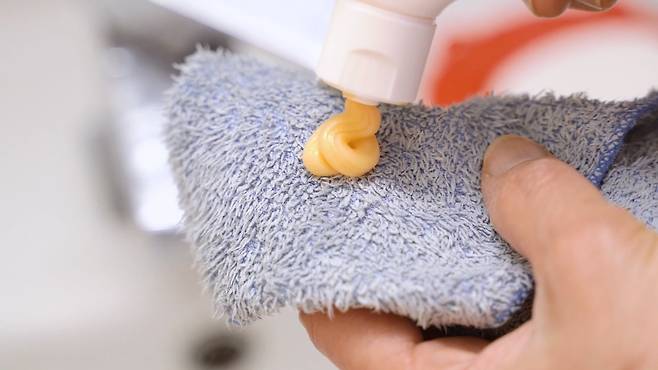 먼저 안경 천을 하나 준비해 주세요. 여기에 콩알만큼 린스를 짜서 준비해 줍니다.