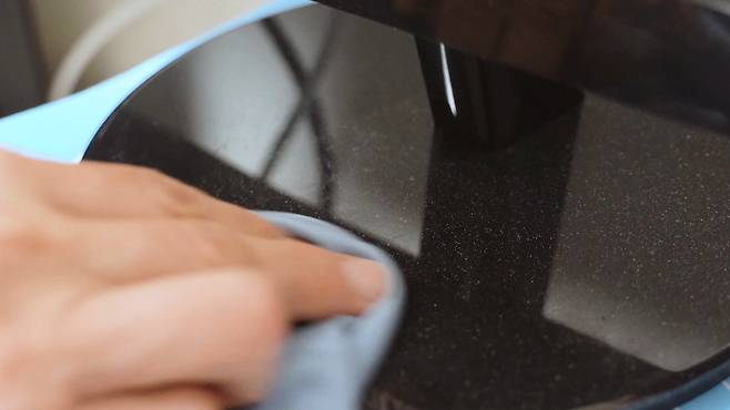 부드러운 천에 린스를 콩알만큼 짜주세요. 먼지가 많이 붙는 곳에 열심히 문질러 코팅시켜 줍니다. 저는 모니터 받침대에 발라 주었어요.