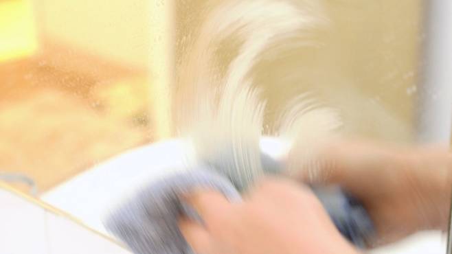 화장실 거울도 마찬가지로 물때가 쉽게 끼는데요. 여기도 마찬가지로 부드러운 천에 린스를 묻혀 자국이 없어질 때까지 문지르세요. 그러면 물때가 쉽게 제거되는데요.