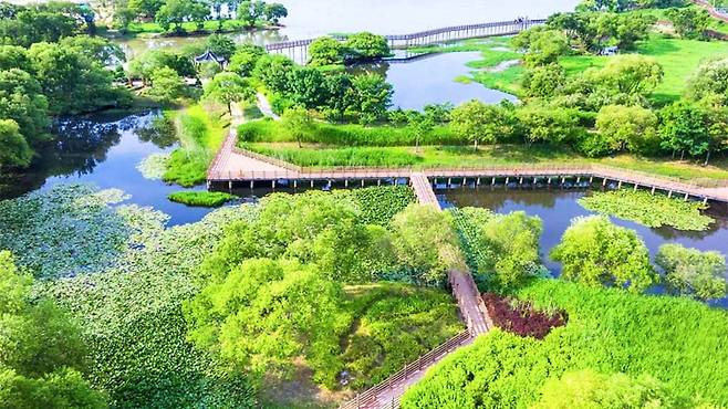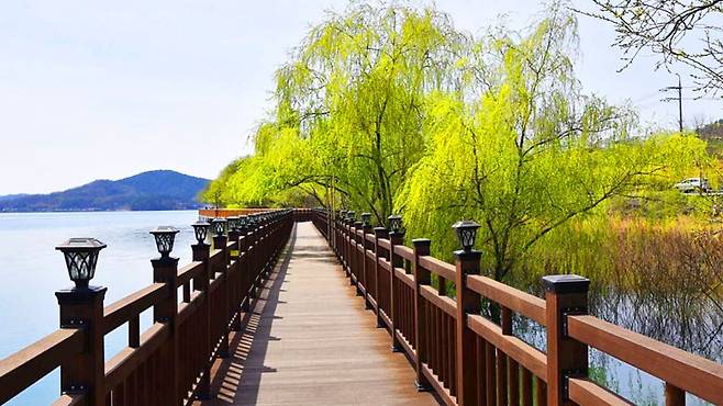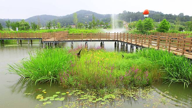 사계절이 분명한 풍경, 물 위를 걷는 듯한 출렁다리, 그리고 조용히 철새가 머무는 호수.