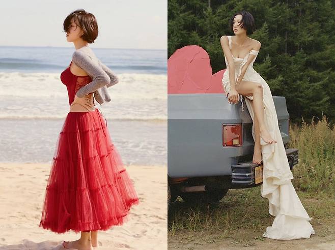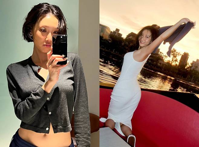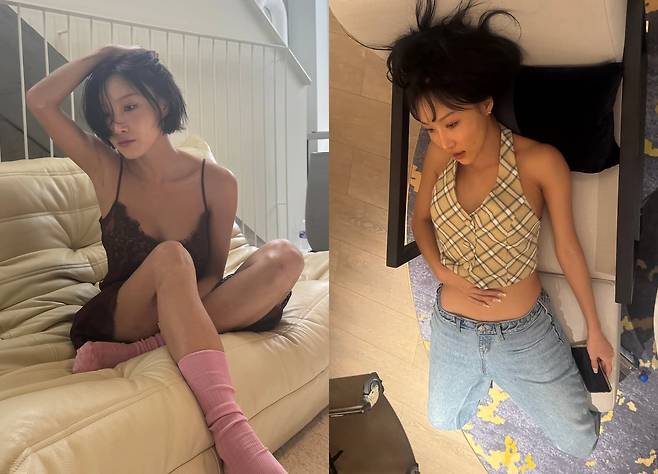 화사는 한층 슬림해진 몸매에 걸맞은 감각적인 스타일링으로 눈길을 끈다. 짧은 단발 헤어와 함께 슬립 원피스, 홀터넥, 크롭 카디건 등을 활용해 세련된 무드를 완성했다.