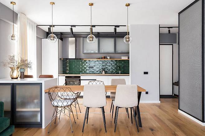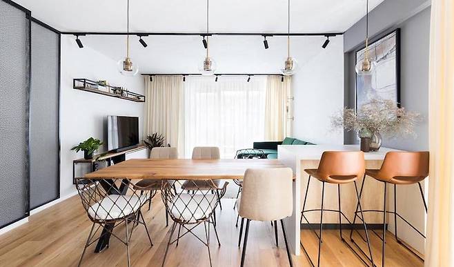 인더스트리얼 스타일을 좋아하는 사람에게는 이 집이 이상적인 가이드라인처럼 느껴질 수 있다. 검은 철제 선으로 공간의 구성선을 또렷하게 드러내고, 따뜻한 원목 가구와 짙은 녹색 패브릭이 무게 중심을 잡는다.