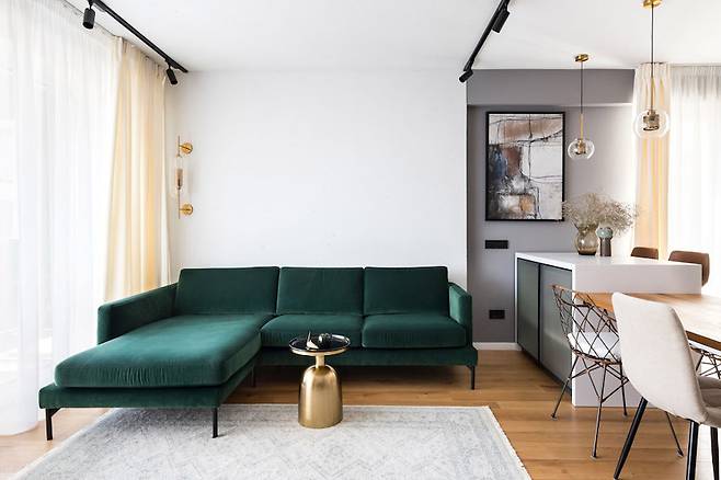 처음 이 아파트의 문을 열면 가장 먼저 느껴지는 건 사적인 공간을 여는 듯한 절제된 묵직함이다. 짙은 다크 그린 컬러가 입구부터 이어지며, 벽을 따라 배치된 매트한 질감의 철제 메시 소재는 공간 전체의 분위기를 단숨에 잡아준다.