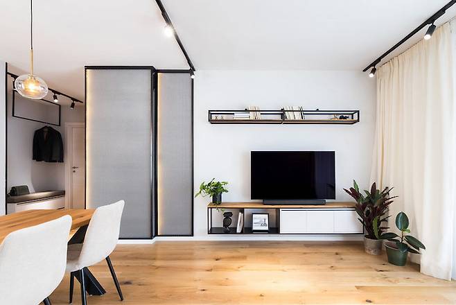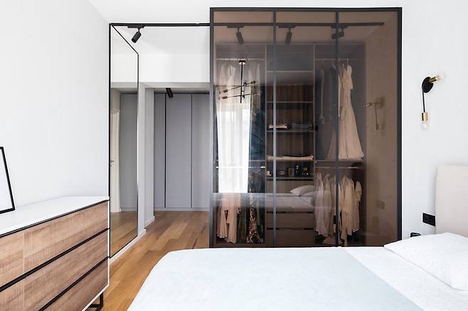 개성 강한 수납장은 이 아파트만의 세계를 보여준다. 이 메시 수납장은 단순한 가구 이상의 역할을 한다. 소재의 통기성과 투명성, 그리고 그 위에 얹히는 은은한 조명은 인더스트리얼 감성을 적절히 살려내는 동시에 시각적인 재미까지 더했다.