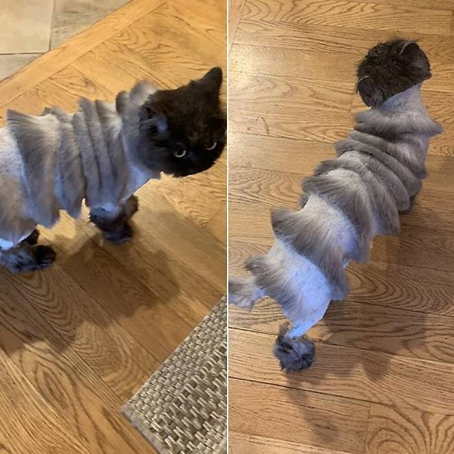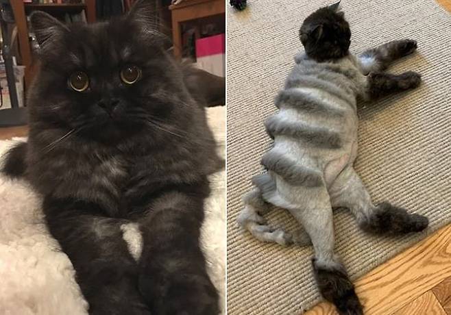 공개된 사진 속에는 미용하기 전 복슬복슬하고 새까만 털을 뽐내고 있는 고양이 모습과 정체불명의 모습으로 미용을 한 고양이 모습이 각각 담겨 있었는데요.