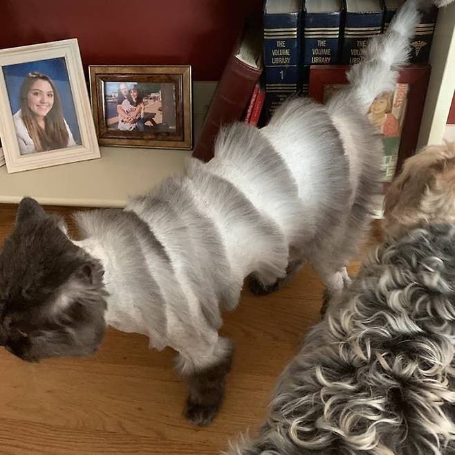 몇 시간 흐른 뒤 미용실에 간 아빠가 고양이랑 같이 집에 돌아왔는데요. 깔끔하게 미용하고 돌아온 줄 알았던 고양이가 충격적인 모습을 하고 있었죠.