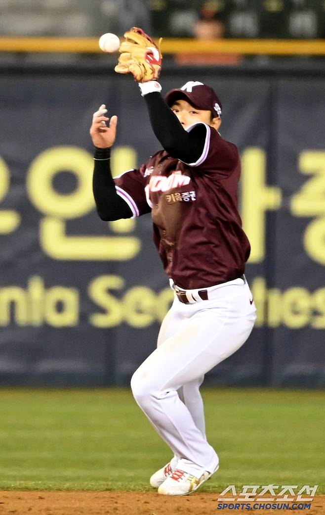2일 잠실야구장에서 열린 키움과 두산의 경기, 4회말 2사 2,3루 키움 유격수 김태진이 두산 강승호의 땅볼 타구를 잡았다 떨어뜨리고 있다. 잠실=허상욱 기자 wook@sportschosun.com/2025.04.02/