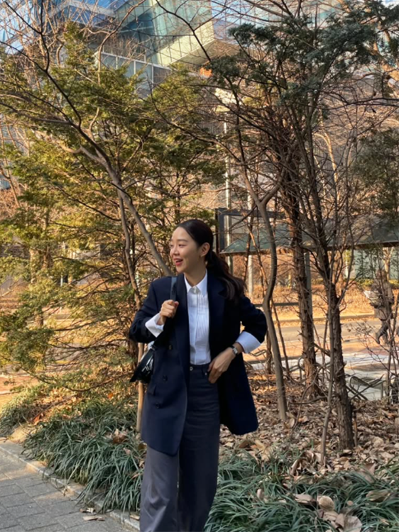 화이트 재킷과 그레이 슬랙스로 완성한 여름 데일리룩