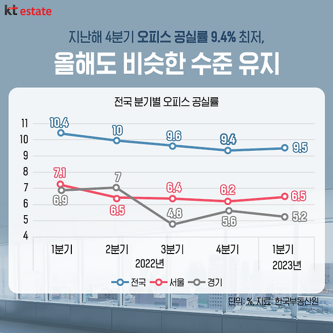 올 초 부동산시장 침체가 지속된 가운데, 오피스 공실률은 조사 이래 최저 수준을 유지하고 있습니다. 한국부동산원 상업용 부동산 임대 동향 자료에 따르면, 지난해 4분기 전국 오피스 공실률은 9.4%로 2013년 이후 최저치를 기록했는데요.