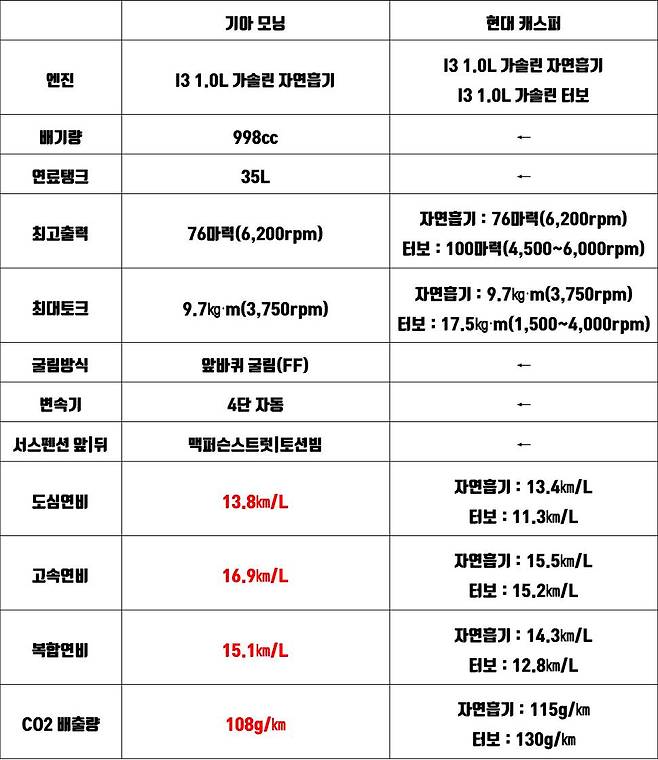 두 차 모두 1.0 자연흡기 기준으로 최고출력 76마력, 최대토크 9.7㎏‧m를 낸다. 굴림방식과 변속기 모두 동일하다. 다만 공차중량 차이 때문에 연비는 모닝이 소폭 앞선다. 도심연비는 0.4㎞/L 차이인데, 고속연비는 모닝이 1.4㎞/L 더 높다. 이산화탄소 배출량 역시 모닝이 적게 나온다.