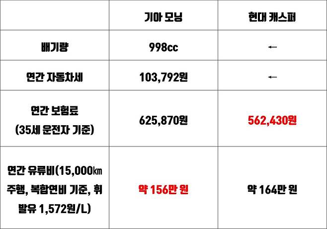 유류비 차이는 어떨까? 연간 15,000㎞ 주행하는 일반 운전자 기준으로, 복합연비와 현재 전국 휘발유 평균가격(1,572원/L)을 대입해 계산했다. 모닝은 약 156만 원, 캐스퍼는 약 164만 원이 발생했다. 즉, 보험료 차이와 유류비 차이를 감안하면, 두 차의 실질적인 유지비는 거의 같다고 볼 수 있다.