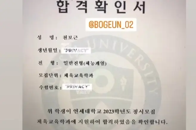 오랜만에 근황이 알려진 천보근의 소식은 바로 그의 개인 계정에서 전해졌다. 천보근은 연세대학교 합격확인서를 인증하며 대학 새내기가 됐음을 인증했다.