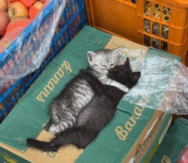 사진을 접한 누리꾼들은 "서로를 끌어안고 자는 모습이 이 세상 가장 완벽한 단짝의 모습이다", "시장 한복판 바나나 박스 위가 저 두 마리에게는 세상에서 제일 좋은 침대였던 것 같다", "이 사진 한 장이 오늘 하루의 피로를 전부 녹여버렸다"라며 뜨거운 반응을 보이고 있습니다.