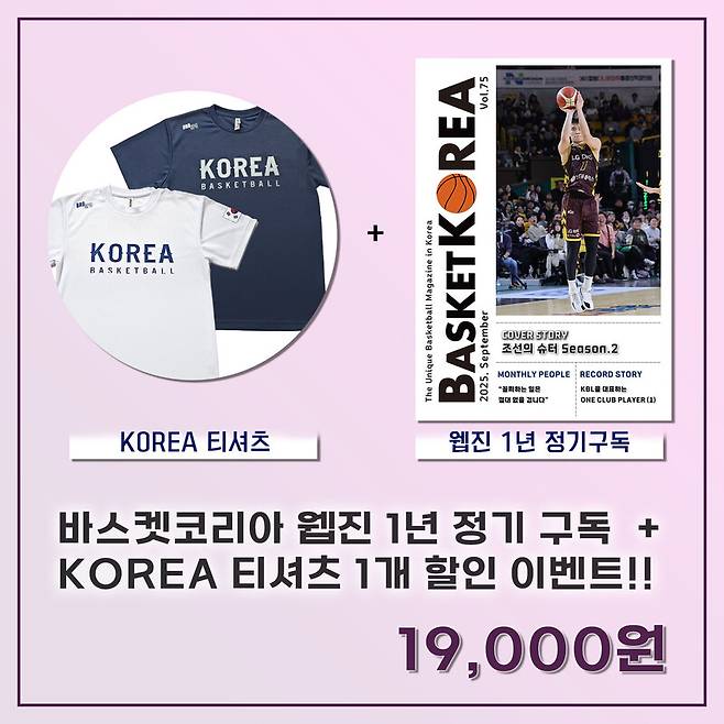 그리고 바스켓코리아 웹진 2025년 9월호와 관련된 프로모션 이벤트도 진행 중이다. 바스켓코리아 웹진 2025년 9월호와 BROSPO에서 제작한 KOREA 티셔츠 1개를 19,000원에 구매할 수 있고, 바스켓코리아 웹진 2025년 9월호만 구매한 이들은 9,000원의 금액으로 더블쿠션 스포츠 양말 4켤레를 받을 수 있다.