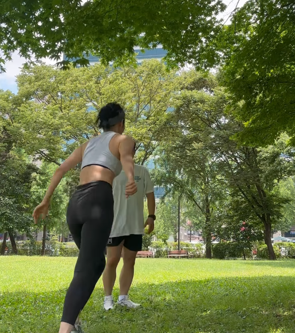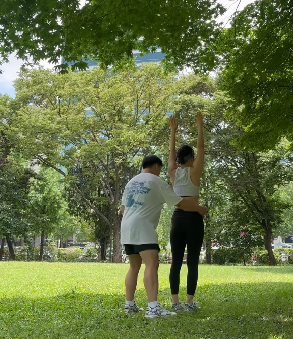 푸른 공원 한복판, 시원한 민소매 크롭탑과 레깅스 차림으로 도전하는 사유리의 모습은 보는 이들에게 긍정 에너지를 전한다.