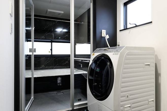 욕실은 블랙을 주제로 세련된 모노톤으로 디자인되었다. 대리석 질감의 타일과 은은한 간접 조명이 어우러져 프라이빗 SPA 공간을 연상시킨다. 별도로 마련된 탈의실은 욕실과의 동선을 고려해 실용성과 미적 조화를 동시에 달성했다.