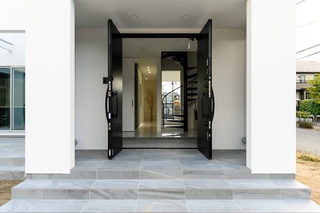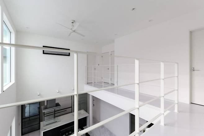집에 들어서면 나선형 계단과 반대편까지 시선을 가로지르는 넓은 창문이 눈에 띈다. 계단의 곡선은 직선 위주의 구조에 부드러운 느낌을 더하며, 회색 벽지는 복도에 온화한 인상을 준다.