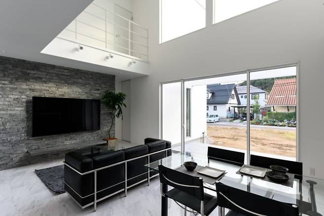 이 집의 중심인 거실은 고급스러운 분위기가 감도는 공간이다. 2층까지 오픈된 천장은 개방감을 더하며, 흑백의 모노톤 색상으로 호텔 같은 깔끔함을 연출했다.