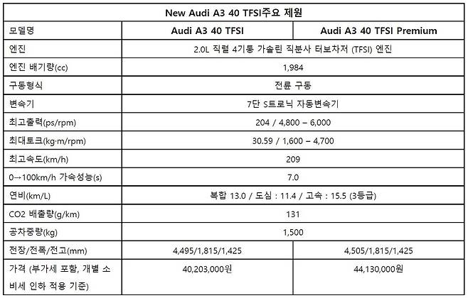 '뉴 아우디 A3 40 TFSI'과 '뉴 아우디 A3 40 TFSI 프리미엄' 두 모델 모두 2.0L 직렬 4기통 가솔린 직분사 터보차저 (TFSI) 엔진과 7단 S트로닉 자동 변속기를 탑재해 최고 출력 204마력, 최대 토크 30.59kg.m의 강력한 주행성능을 발휘한다. 정지상태에서 100km/h까지 가속 시간은 7초, 최고 속도는 209km/h, 연비는 복합 연비 기준 13km/l이다(도심: 11.4km/l, 고속도로: 15.5km/l). 또한, '아우디 드라이브 셀렉트'를 통해 주행 상황에 따라 주행 모드를 변경하거나 개인별 취향에 맞는 주행 모드를 선택할 수 있다.