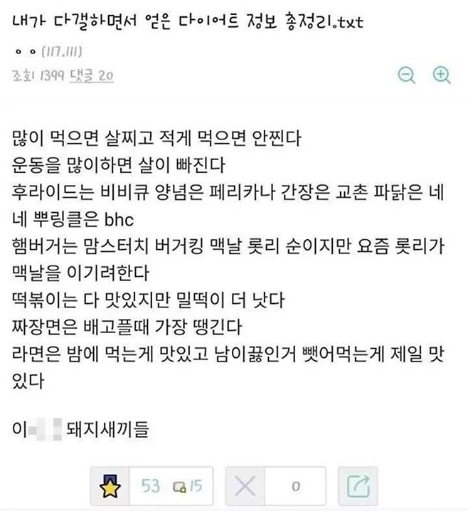 개수로 치면 적지 않은 정보를 얻었지만, 그중 살 빼는 것과 관련된 정보는 겨우 두 줄 뿐이다. 그마저도 지극히 당연한 소리에 불과하다. 그 외의 정보는 오히려 살 빼는 데 방해가 되는 것들이다. (그래도 틀린 소리는 없더라. 햄버거 관련 정보는 진짜 진리다. 맘스터치가 진리고 다음은 버거킹 맞다) 결국, 이 네티즌은 웃프게도 ‘이 XX 돼지 새끼들’이라며 한탄을 내뱉었다.