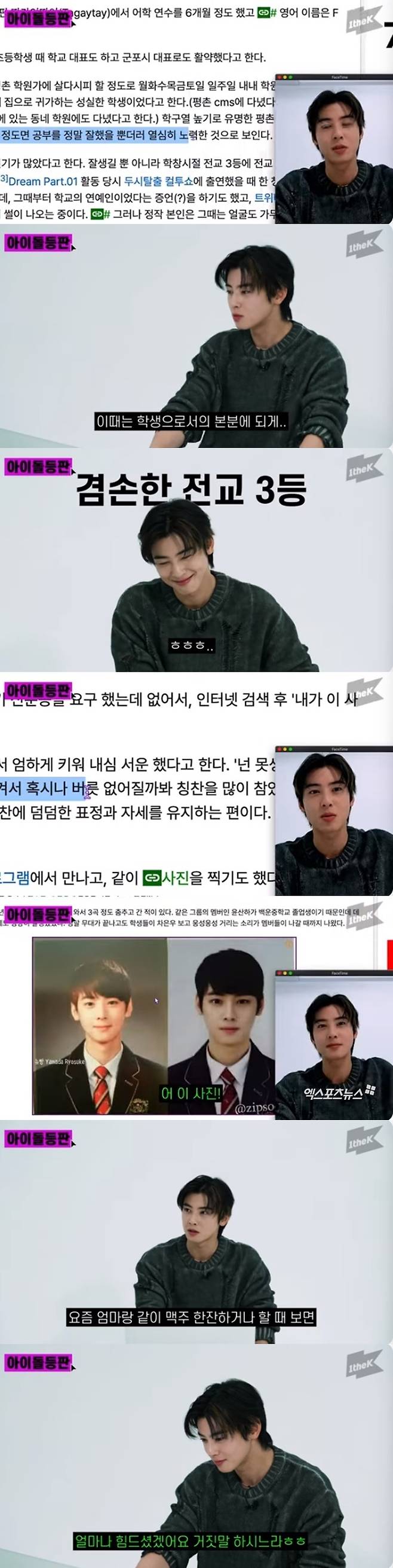 '중학교 때부터 완성형 미모라 산본에서 유명했고 전교회장, 축구, 농구부 주장을 하면서 전교권 성적을 유지했으며 학생들 사이에서 분만 아니라 학부모와 다른 학교에서도 유명했다고 한다'라는 설명에는 부끄러워했다.