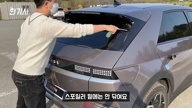 근데 이게 하자가 하나 있어요. 뒤 스포일러가 되게 길게 나와 있거든요. 이렇게 용도가 뭐냐면 비가 왔을 때 물기를 다 털어내기 때문에 뒷 와이퍼가 없다고 현대는 주장을 해요. 근데 눈 한번 와보면 난리 납니다. 우천 시나 눈이 왔을 때 뒷 시야는 포기해야 돼요. 그냥 탑차 모는 것 같아요. 그리고 지금도 세차를 하면 스포일러 밑에는 안 닦여요. 거긴 내가 닦아줘야 돼요.