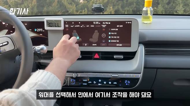 센터패시아에 버튼들이 많이 없어요. 이게 불만 중에 하나예요. 예를 들어 시트에 열선과 냉풍이 되거든요. 그것까진 좋은데 그걸 설정하려면 워머를 선택해서 내비 안에서 조작을 해야 돼요. 이게 굉장히 불편한 부분이고, 특히나 EV6 같은 경우는 열선, 통풍 버튼이 바로 운전석 옆에 따로 나와있거든요. 바로 조작을 하면 되는데, 이건 여기 갔다가, 내비게이션 갔다가 하는 게 조작은 좀 불편하긴 해요.